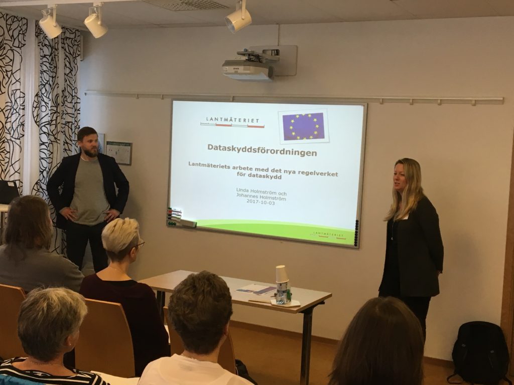 Sista passet innan lunch handlade om Dataskyddsförordningen och presenterades av Linda Holmström samt Johannes Holmström, Lantmäteriet. Förordningen träder i kraft 25 maj 2018 och gäller direkt som lag. Kompletterande bestämmelser införs samtidigt i den nya dataskyddslagen och Personuppgiftslagen (PUL) kommer att upphöra att gälla. Efter lunchen fortsatte vi dagen med ett pass om översiktsplanering som Petronella Enström, Boverket höll i.