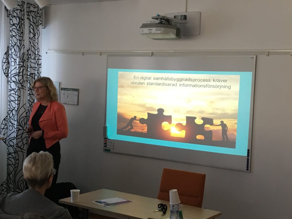 Sist ut var Elisabeth Argus, BonaCordi AB som är engagerad i arbetet med att effektivisera samhällsbyggnadsprocessen vilket inte låter göra sig i en handvändning. Många olika projekt pågår, här fick vi en presentation av vilka de är och hur de hänger ihop. Allt för ofta samlas samma information in igen, återanvändning är det som gäller. En mycket bra dag med bra föredragshållare och intresserade åhörare. Presentatörernas föredrag återfinns på föreningens hemsida.
